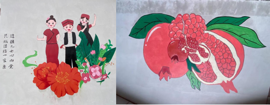 活动自启动以来,得到了当地村民的热烈响应和积极参与。村民们主动开车接送师生深入联盟村11个村民小组,用他们的巧手和妙笔,将一面面普通的墙体变成了色彩斑斓的艺术品。墙绘作品描绘了多民族人物风情,老乡们熟悉石榴、兰花、竹子,每一笔每一划都凝聚着师生们的智慧和心血。师生们忘却了饥饿的困扰,全身心地投入到绘画之中。师生们不畏烈日炎炎,不惧狂风暴雨,暮色渐浓无法阻挡他们手中的画笔舞动,他们一直在室外辛勤地绘制,时钟的指针悄然指向了21点,师生们才返回就餐。这份对艺术的执着与热爱,让老乡们不禁为之动容。