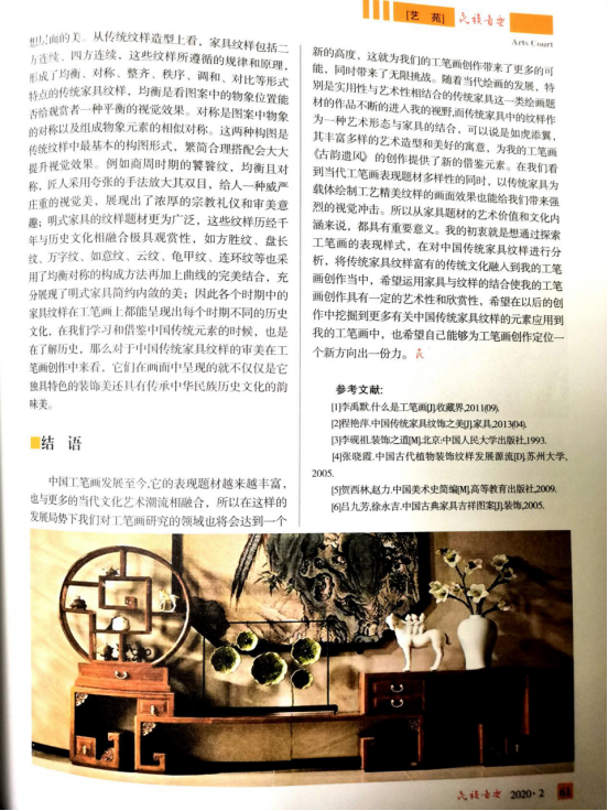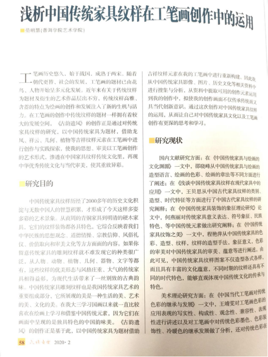 艺术学院培养专业创作性与学术研究性并重人才初现成效,以往学院人才培养成效在专业技能方面效果明显,学生在各大专业技能竞赛中取得佳绩,现今学院在培养学术研究性人才方面也见硕果。2018级美术班张丽同学在知网CNKI知识战“疫”有奖征文活动中获优秀奖;李丽祥老师指导2016级美术班范明慧同学论文《浅析中国传统家具纹样在工笔画创作中的运用》在2020年02期《民族音乐》杂志中发表。