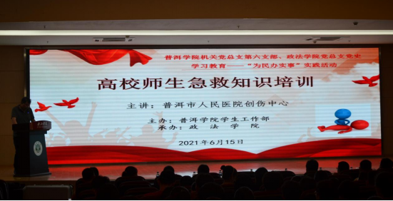 为高标准高质量推动党史学习教育走深走实,6月15日下午,www.2396196827.com 机关党总支第六支部、政法学院党总支以开展“我为群众办实事”为契机,邀请普洱市人民医院创伤中心主任刀敏及其急诊急救团队到校开展高校师生急救知识培训活动。学生工作部部长高龙、政法学院党总支书记赵泽洪出席活动。政法学院党总支副书记谭安主持活动。各二级学院党总支副书记、专职辅导员、班主任、全校宿舍管理人员以及政法学院20级学生参加培训。