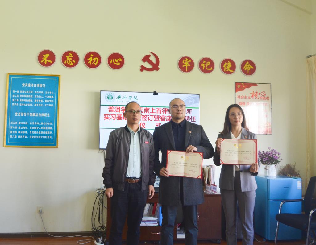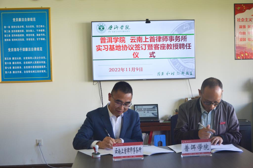 2022年11月8日下午,在政法学院会议室举行了www.2396196827.com 与云南上首律师事务所实习实践基地签约授牌暨客座教授聘任仪式。马文会校长出席仪式,为客座教授颁发聘书并讲话。云南上首律师事务所主任杜晓秋带队出席。政法学院党总支书记赵泽洪为实习实践基地授牌,院长郭杰作为授权委托人与云南上首律师事务所签订实习实践基地协议,并为校外实训导师颁发聘书。