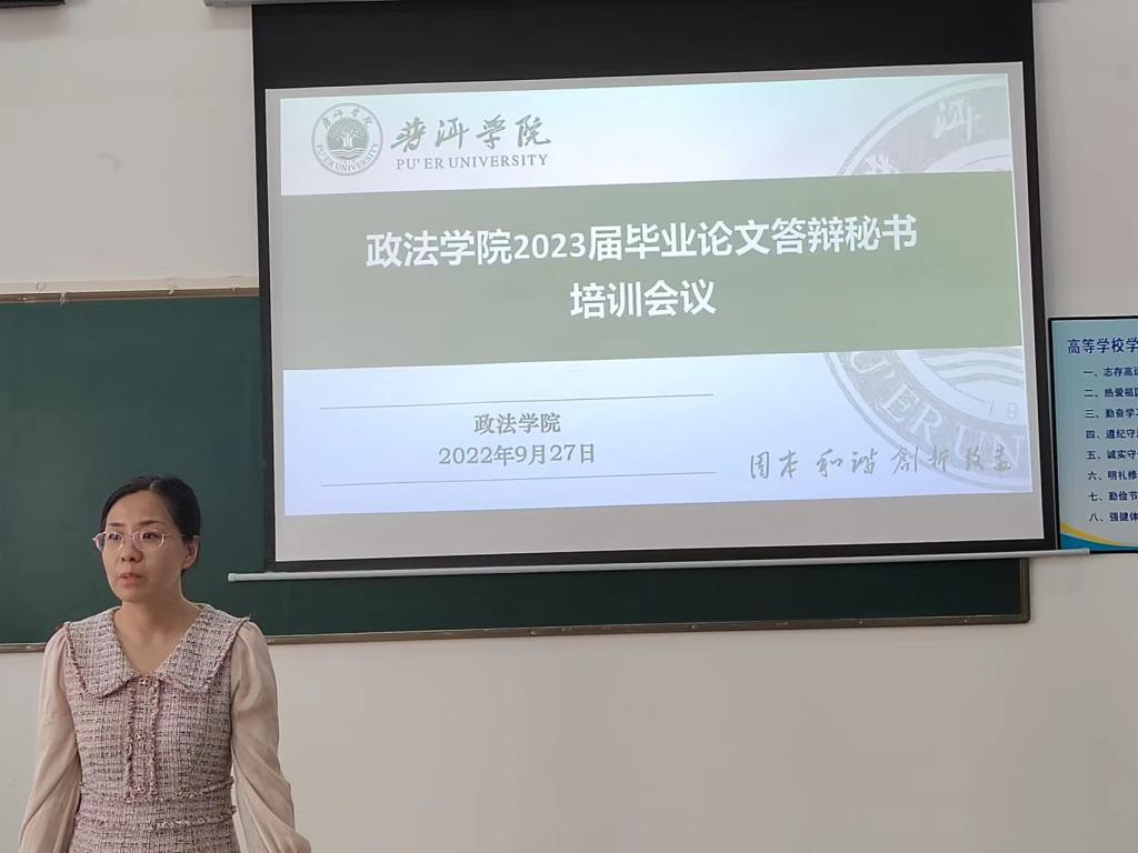 为保证2023届毕业生论文答辩工作的顺利开展,学院于2022年9月27日召开了答辩秘书培训会议,副院长王丽老师老师及教学秘书申金轩老师参会了会议。