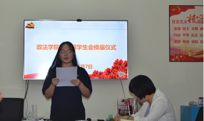 第三项议程:听取和审议政法学院第九届学生会工作报告。第九届学生会主席矣蕾发言。