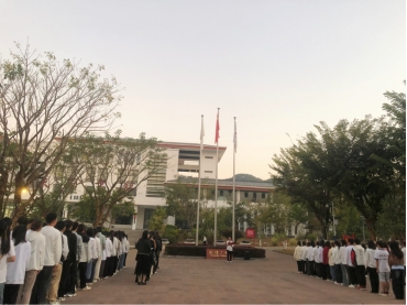 上午7:20,晨光初露,师生们肃然而立。国旗队昂首阔步,步伐坚定,行进间整齐划一。庄严的国歌声中,五星红旗冉冉升起,迎风飘扬。