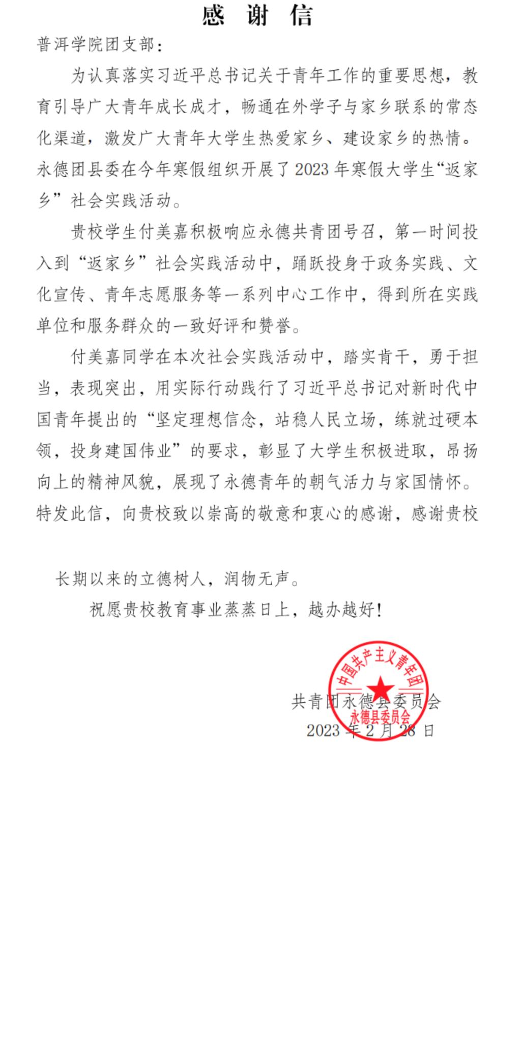 3月7日,我院收到一封来自永德县委的感谢信。信中对我院22级民族班(本)付美嘉同学积极响应号召,踊跃投身“返家乡”社会实践活动展示出的踏实肯干,勇于担当的大学生精神风貌提出表扬和感谢,并对我校人才培养工作成效给予了充分肯定。